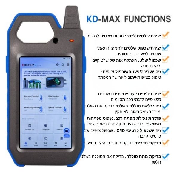 בעזרת ה-KD-MAX תוכלו לבצע מגוון פעולות מורכבות ללא צורך במכשירים נוספים, החל מיצירת שלטים ועד לניתוח מעמיק של שבבים (טרנספונדרים).