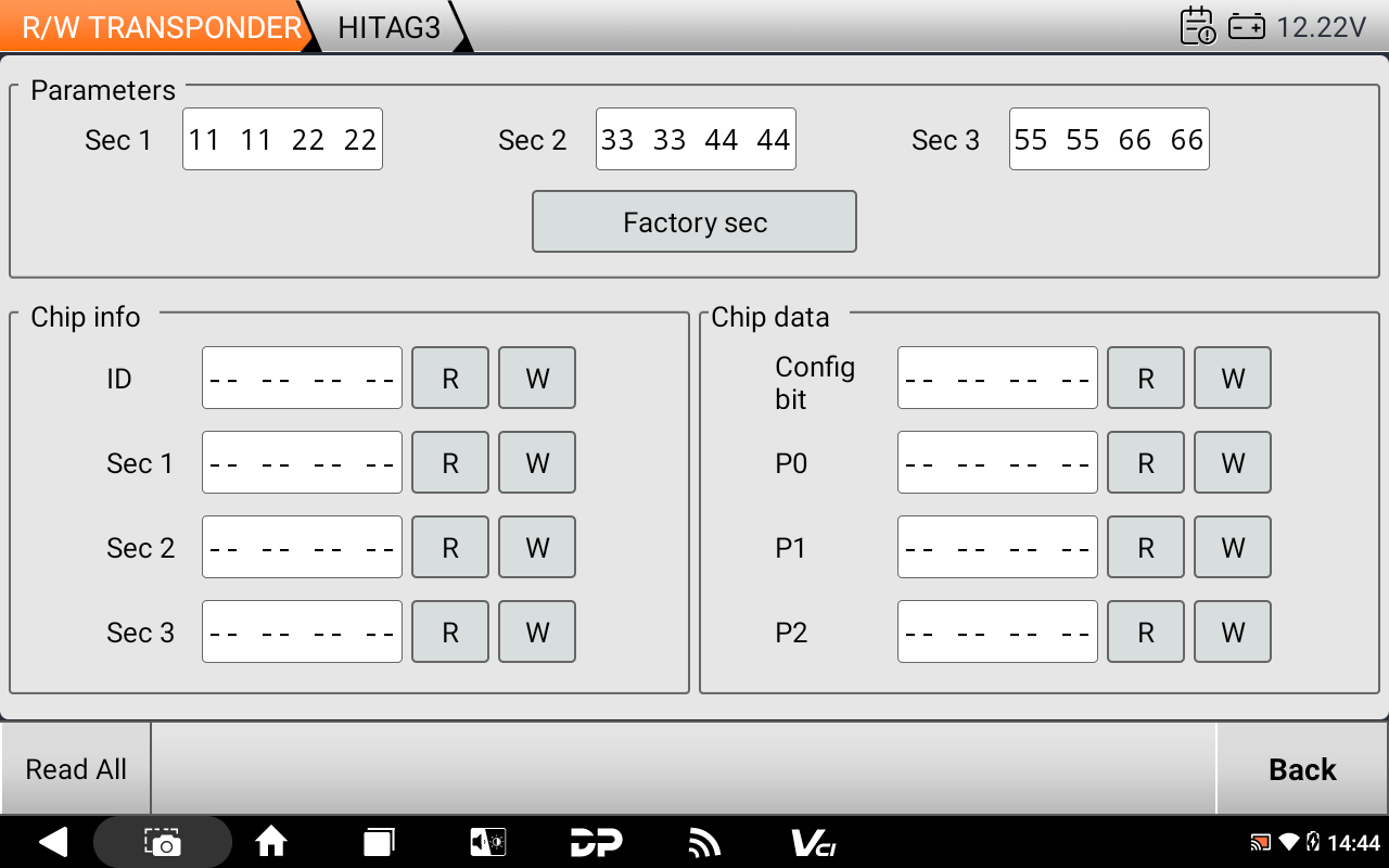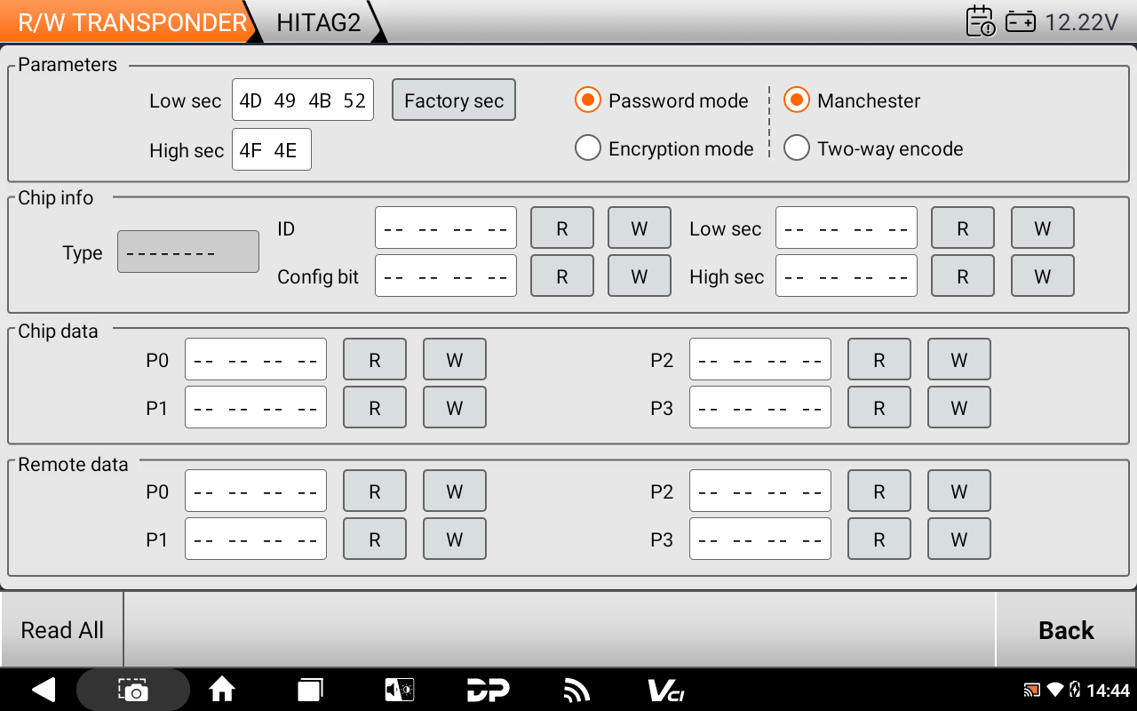 R/W Transponder (קריאה/כתיבה): קיצור ל-Read/Write. זה מאפשר לך לקרוא את המידע מהצ'יפ הקיים כדי להבין איזה סוג הוא (למשל ID46, ID48, 4D-67 וכו').