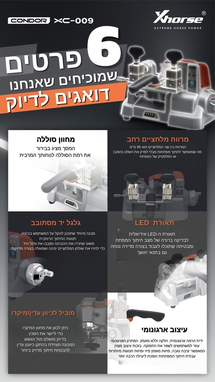 ה-Xhorse Condor XC-009 היא מכונת חיתוך מפתחות המיועדת למנעולנים שצריכים ביצועים גבוהים גם מחוץ לחנות.